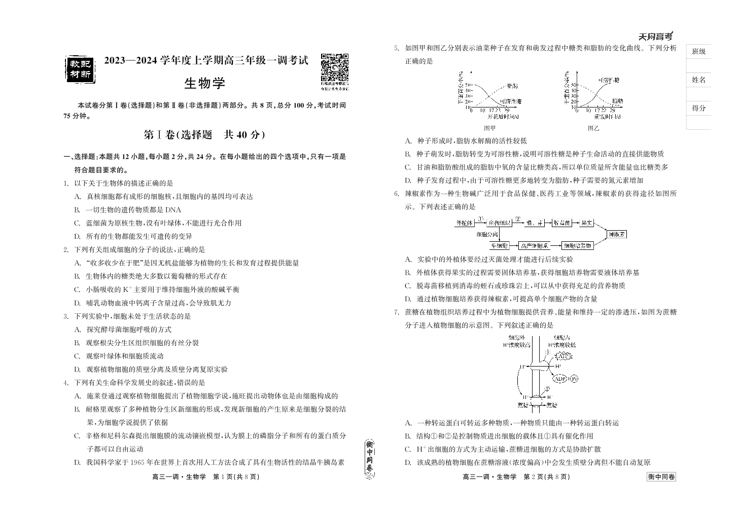 衡中同卷2023-2024学年度上学期高三年级一调考试 生物