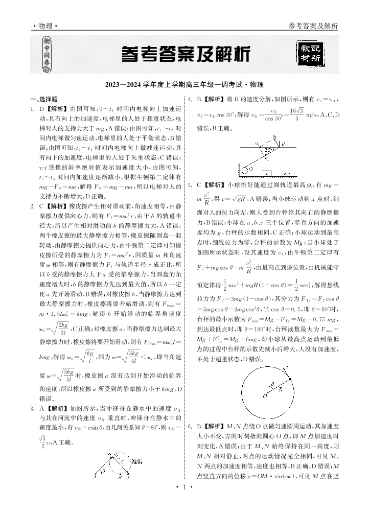 衡中同卷2023-2024学年度上学期高三年级一调考试 物理答案