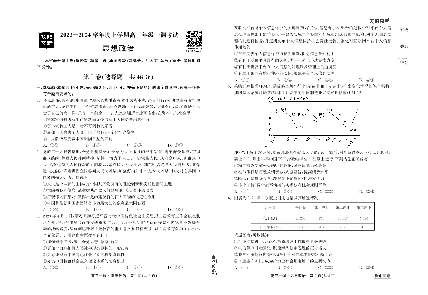 衡中同卷2023-2024学年度上学期高三年级一调考试 政治