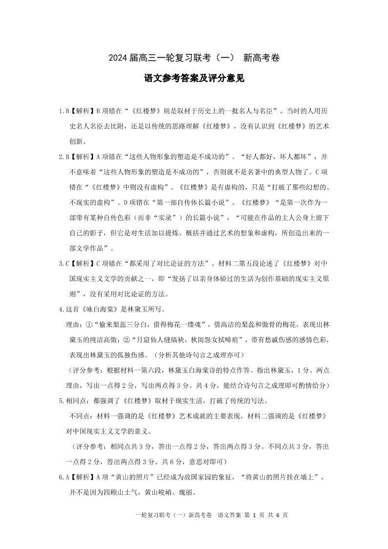 百师联盟2024届高三一轮复习联考(一)语文答案