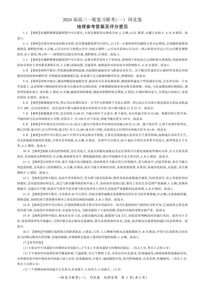百师联盟2024届高三一轮复习联考(一)地理答案
