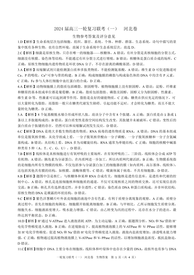 百师联盟2024届高三一轮复习联考(一)生物答案