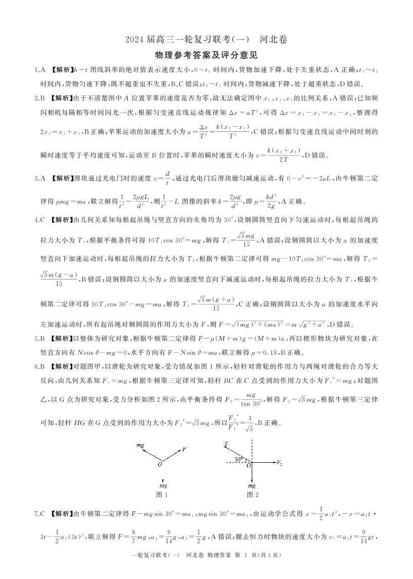 百师联盟2024届高三一轮复习联考(一)物理答案
