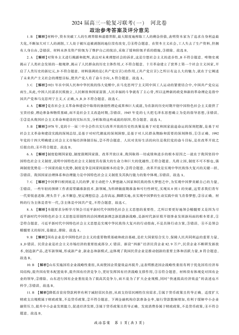 百师联盟2024届高三一轮复习联考(一)政治答案