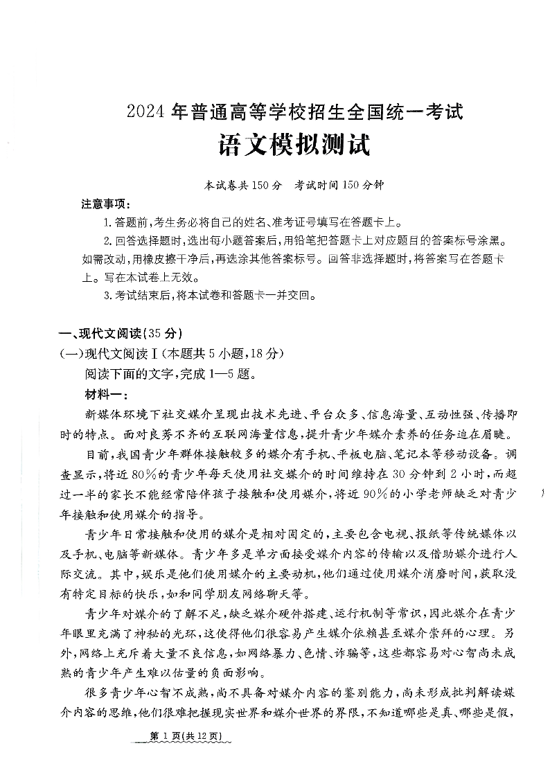 2024届河北省高三下学期普通高中学业水平选择性考试 语文