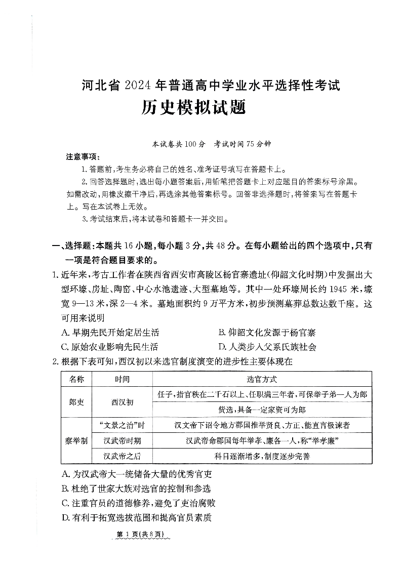 2024届河北省高三下学期普通高中学业水平选择性考试 历史