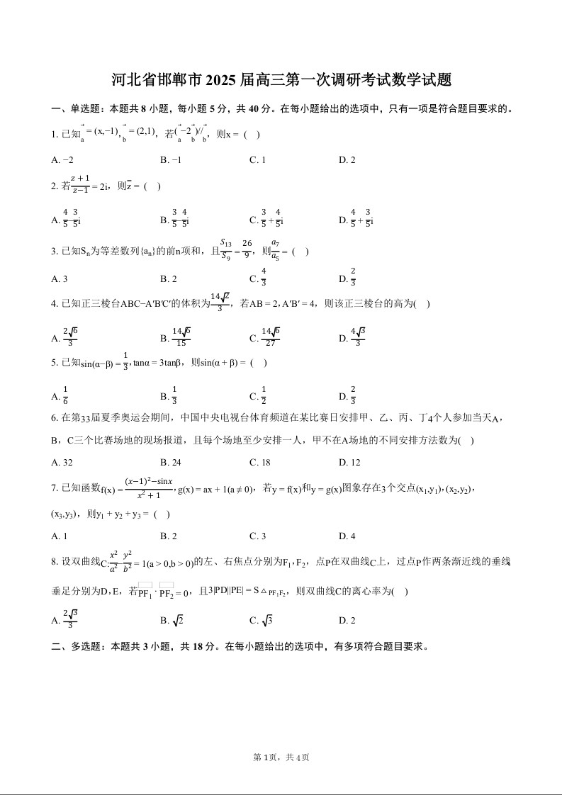 邯郸市2025+届高三年级第一次调研监测+数学