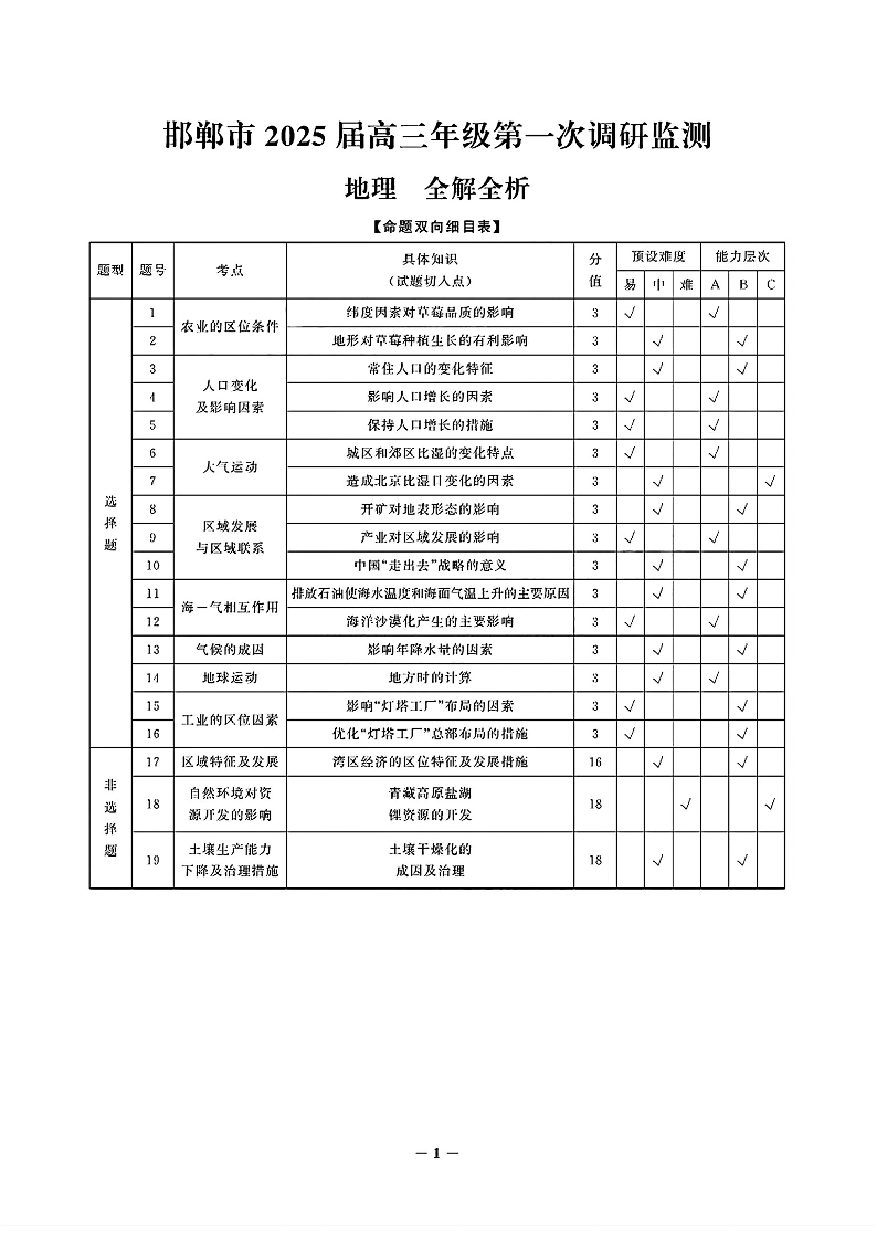 邯郸市2025+届高三年级第一次调研监测+地理答案