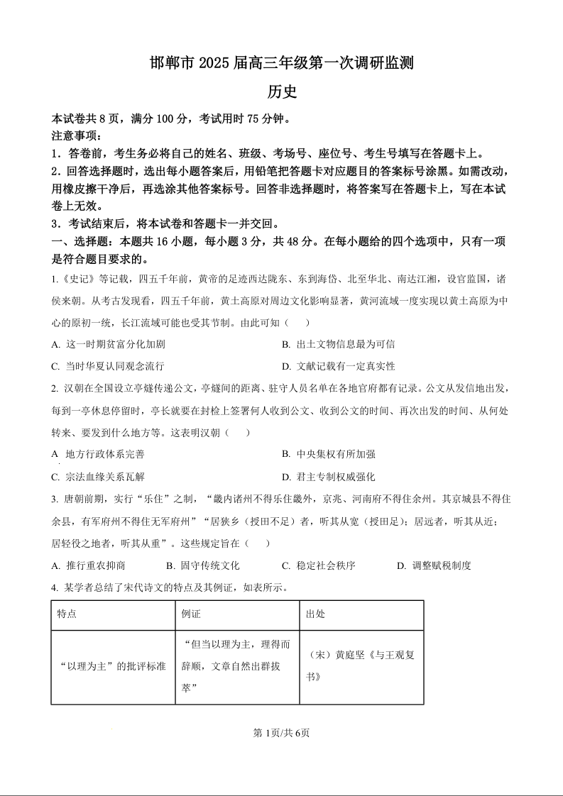 邯郸市2025+届高三年级第一次调研监测+历史