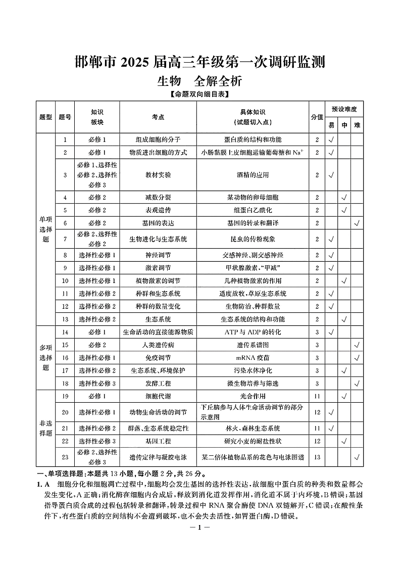 邯郸市2025+届高三年级第一次调研监测+生物答案
