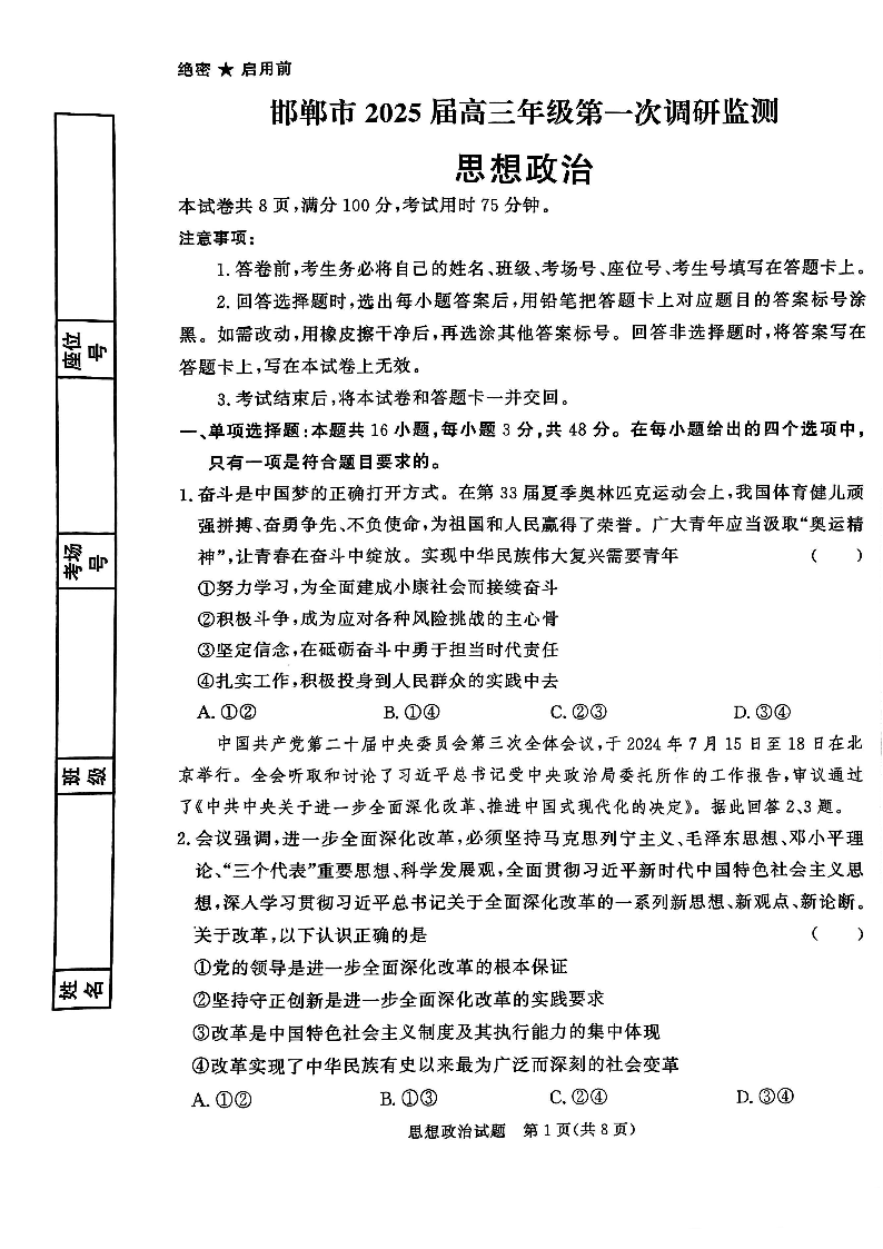 邯郸市2025+届高三年级第一次调研监测+政治
