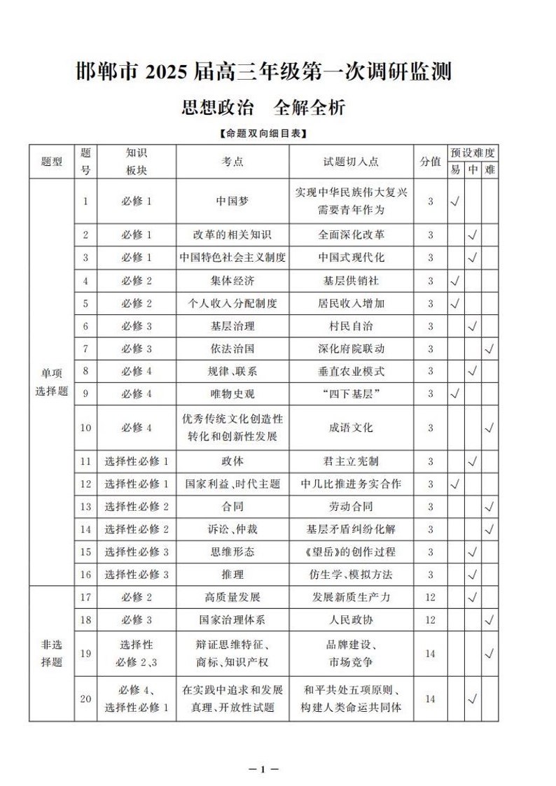 邯郸市2025+届高三年级第一次调研监测+政治答案