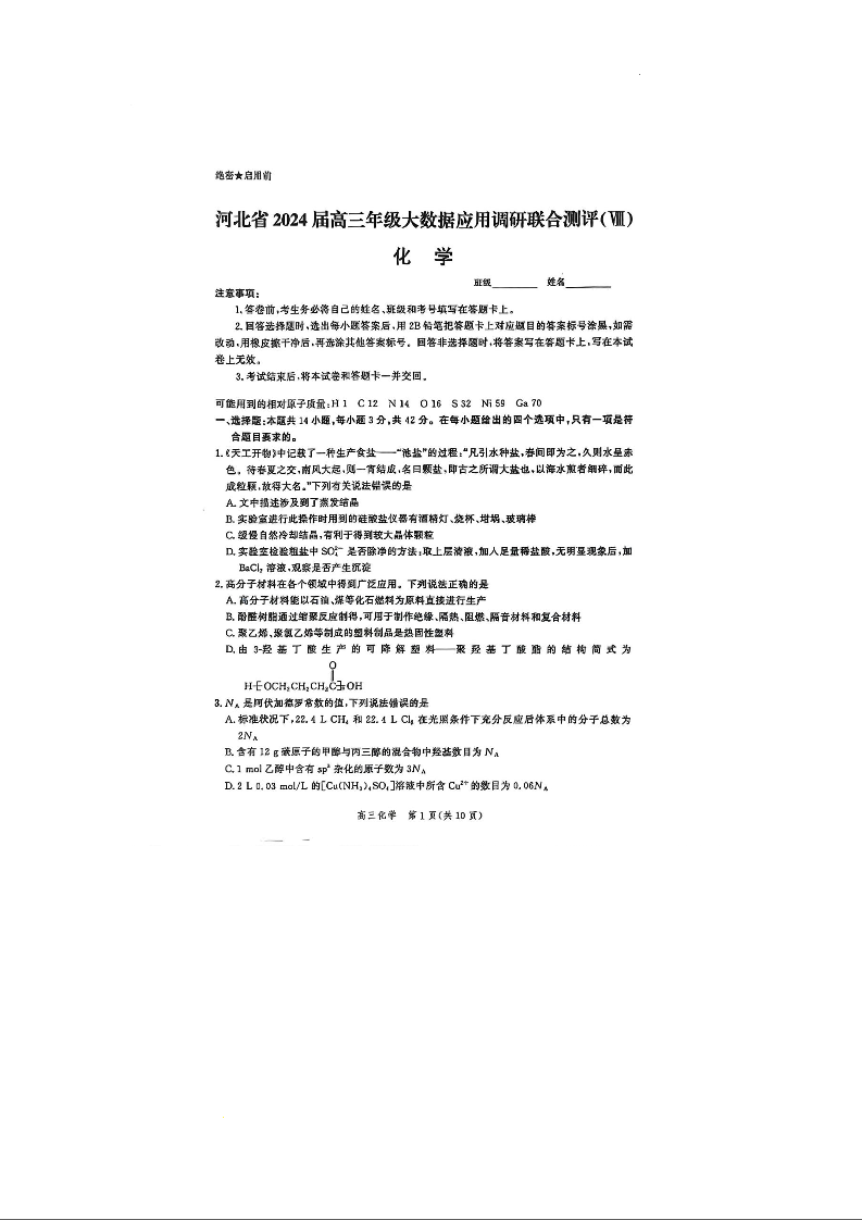 河北省2024届高三年级下学期大数据应用调研联合测评(Ⅷ)化学