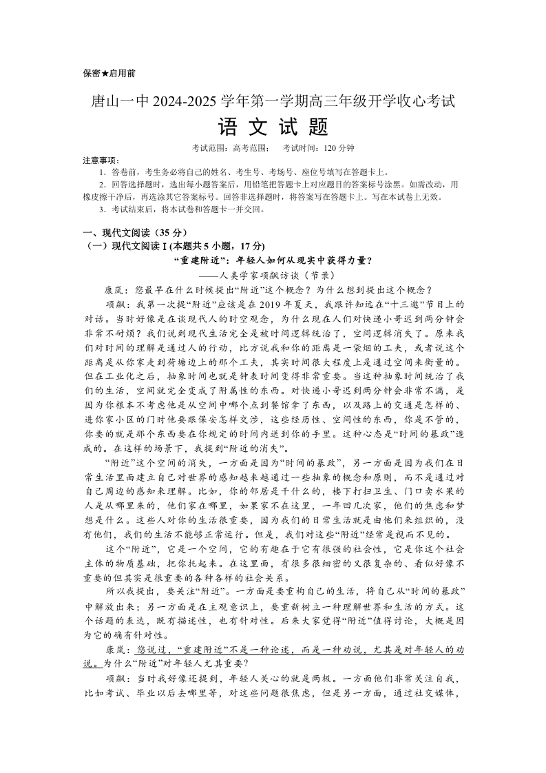河北省唐山市第一中学2024-2025学年高三上学期开学收心考试+语文