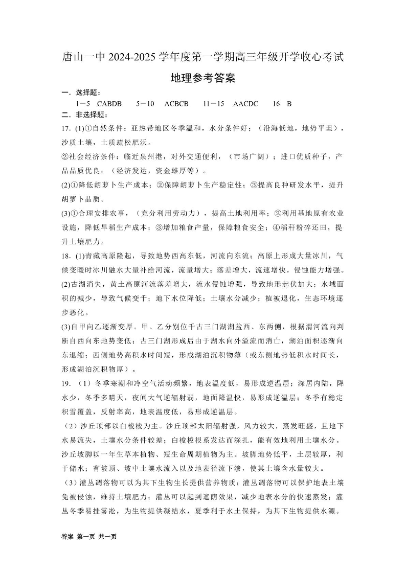 河北省唐山市第一中学2024-2025学年高三上学期开学收心考试+地理答案