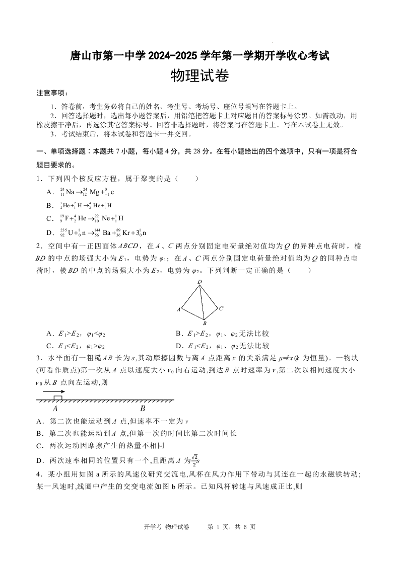 河北省唐山市第一中学2024-2025学年高三上学期开学收心考试+物理