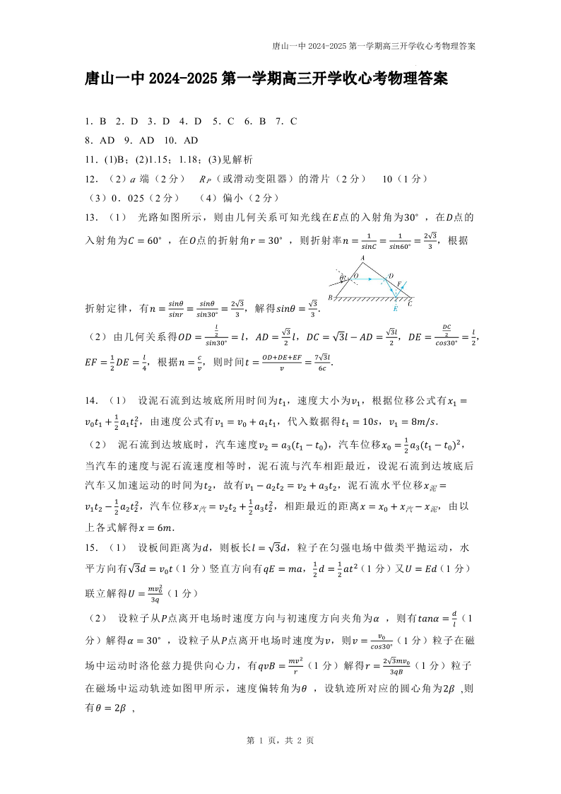 河北省唐山市第一中学2024-2025学年高三上学期开学收心考试+物理答案