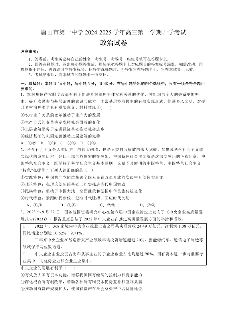 河北省唐山市第一中学2024-2025学年高三上学期开学收心考试+政治