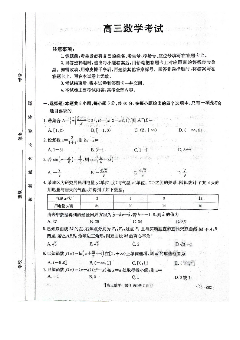 河北省邢台市邢襄联盟2024-2025学年高三上学期开学考试+数学