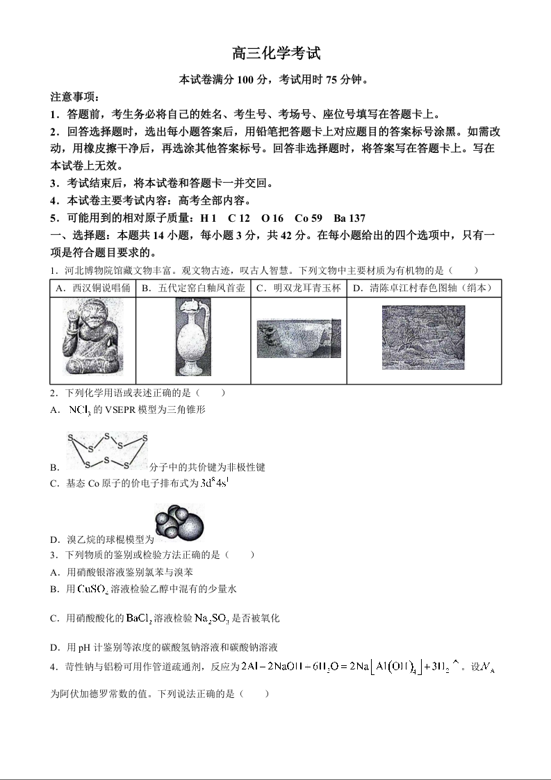 河北省邢台市邢襄联盟2024-2025学年高三上学期开学考试+化学