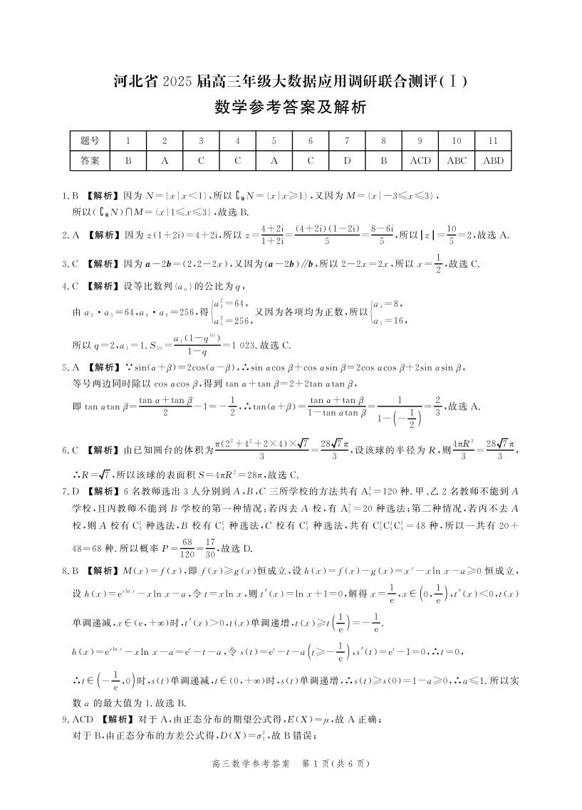 河北省2025届高三大数据9月应用调研联合测评(Ⅰ)数学答案