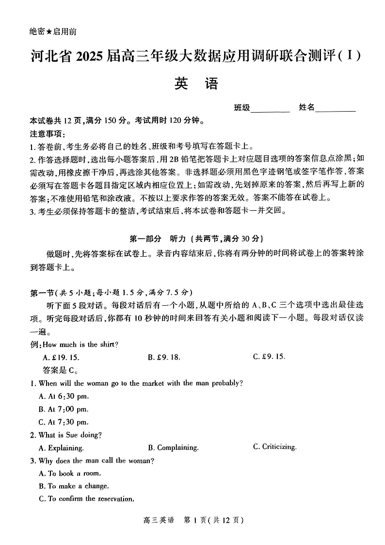 河北省2025届高三大数据9月应用调研联合测评(Ⅰ)英语