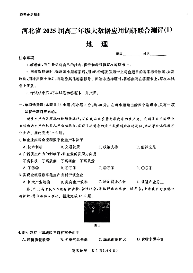 河北省2025届高三大数据9月应用调研联合测评(Ⅰ)地理