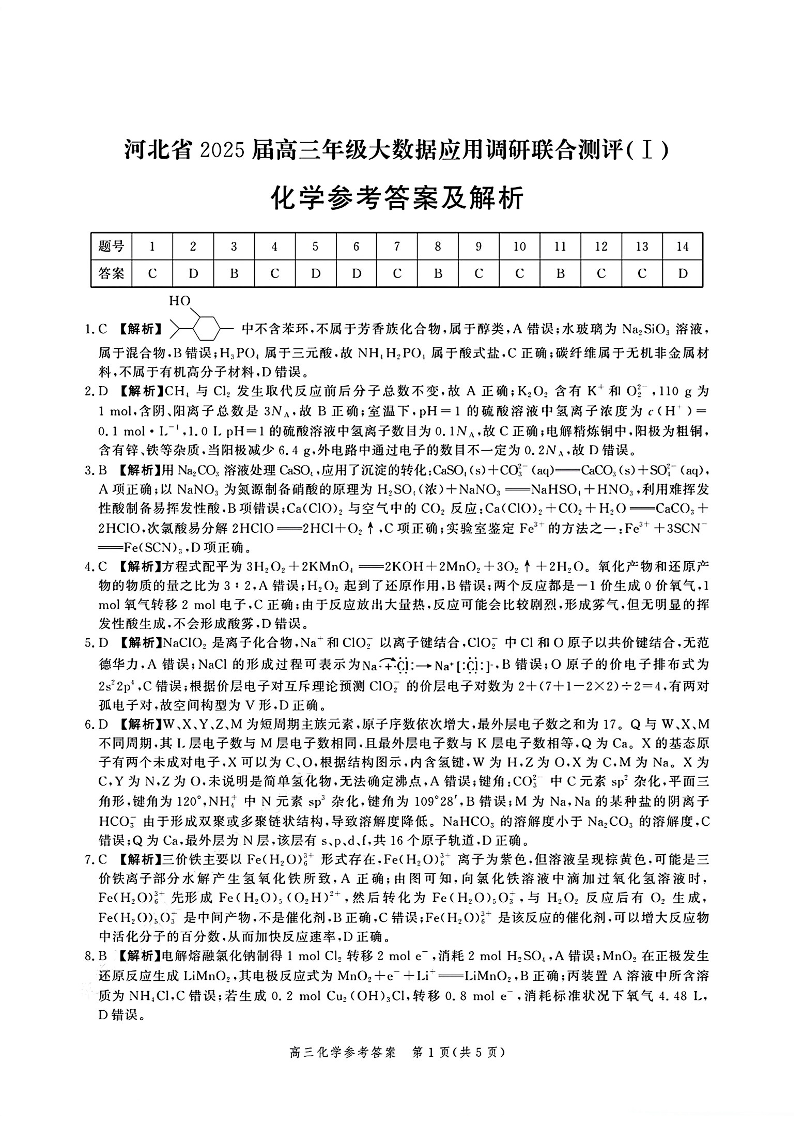 河北省2025届高三大数据9月应用调研联合测评(Ⅰ)化学答案