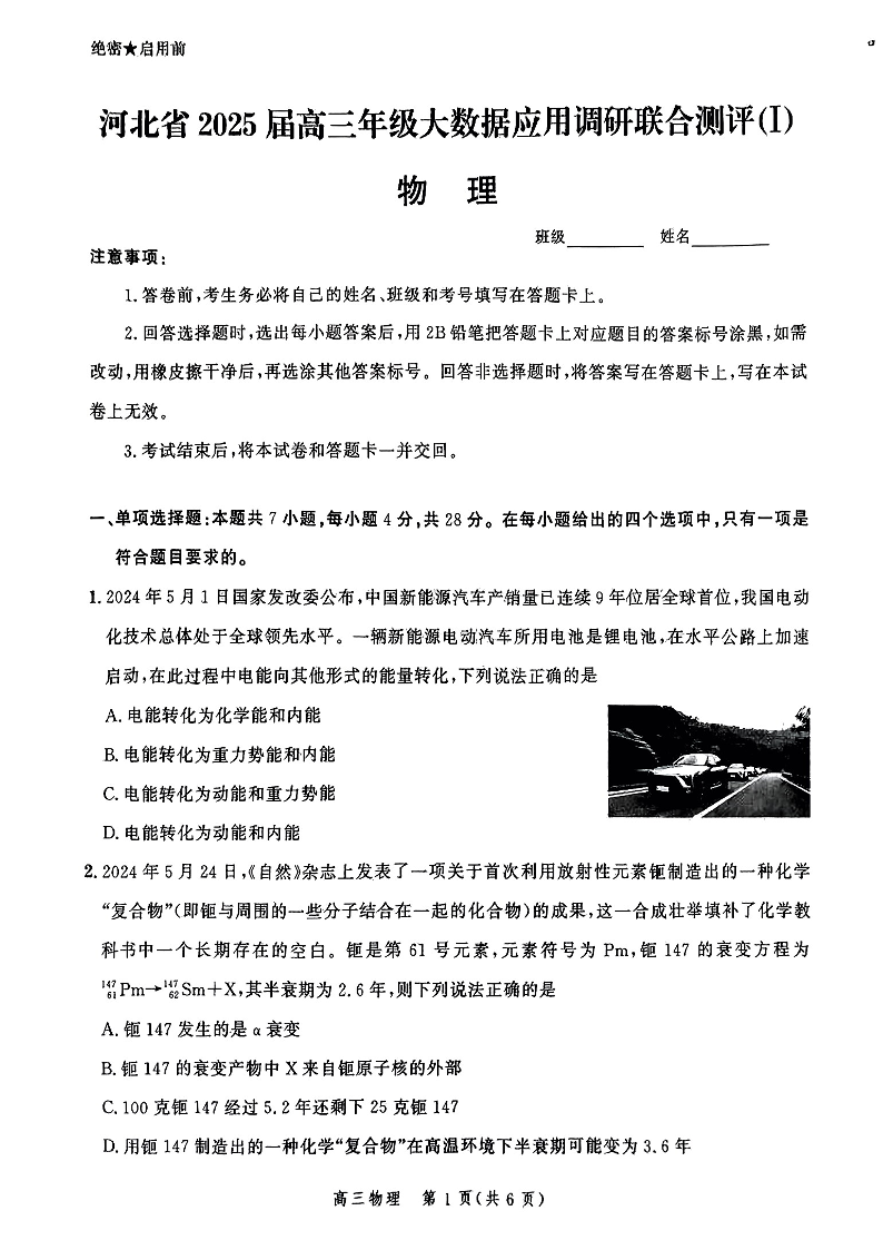 河北省2025届高三大数据9月应用调研联合测评(Ⅰ)物理