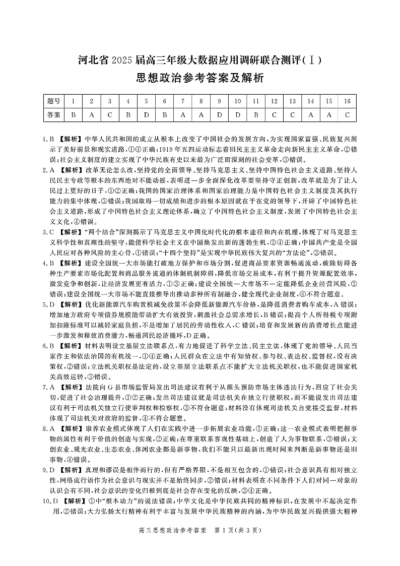 河北省2025届高三大数据9月应用调研联合测评(Ⅰ)政治答案
