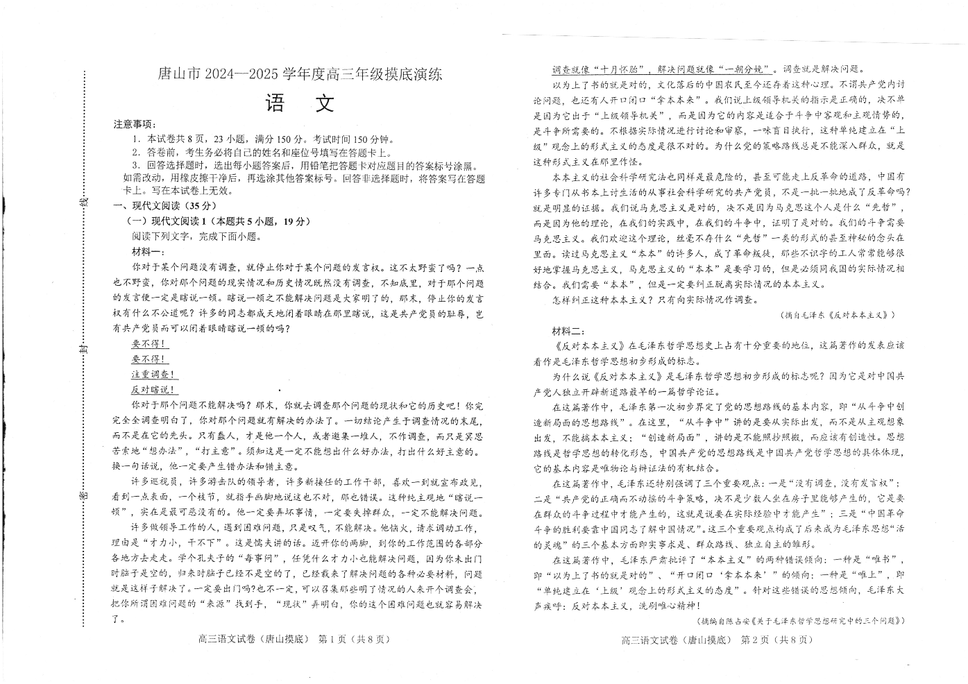 河北省唐山市2024-2025学年高三上学期摸底演练+语文