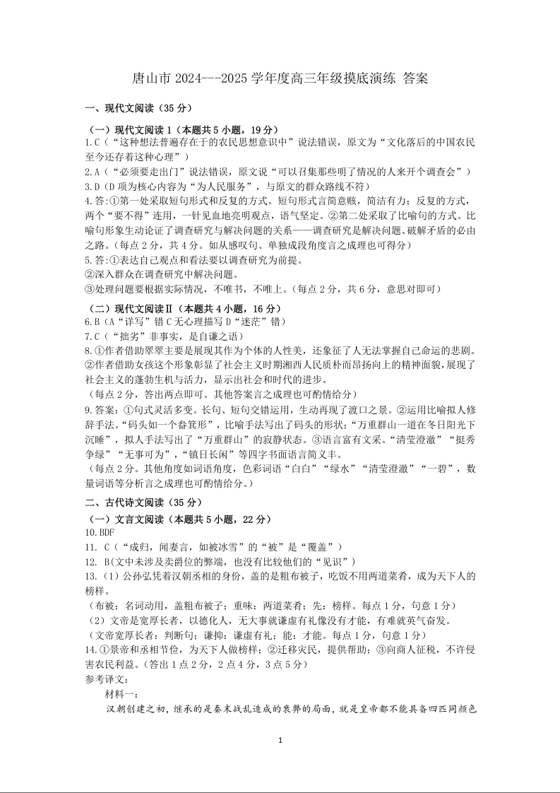 河北省唐山市2024-2025学年高三上学期摸底演练+语文答案