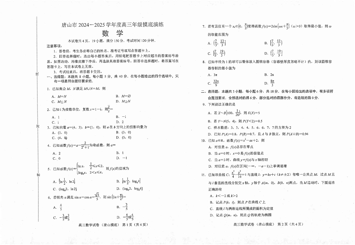 河北省唐山市2024-2025学年高三上学期摸底演练+数学