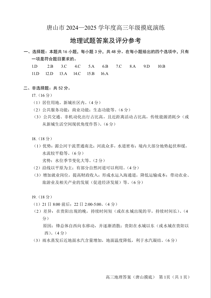 河北省唐山市2024-2025学年高三上学期摸底演练+地理答案