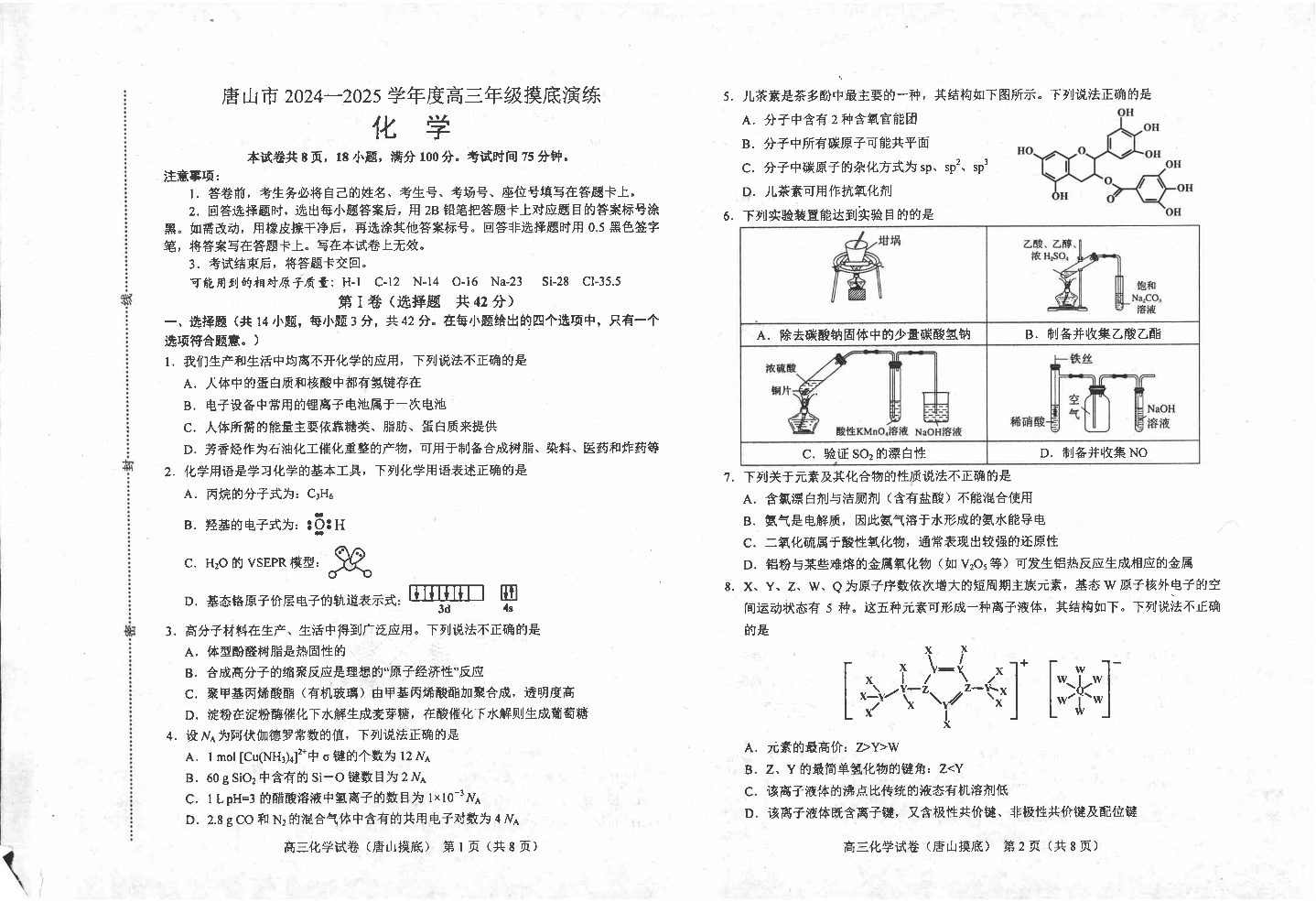 河北省唐山市2024-2025学年高三上学期摸底演练+化学
