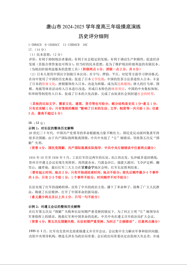 河北省唐山市2024-2025学年高三上学期摸底演练+历史答案