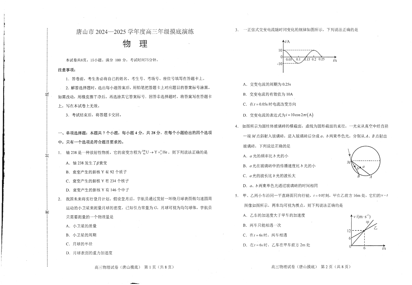 河北省唐山市2024-2025学年高三上学期摸底演练+物理