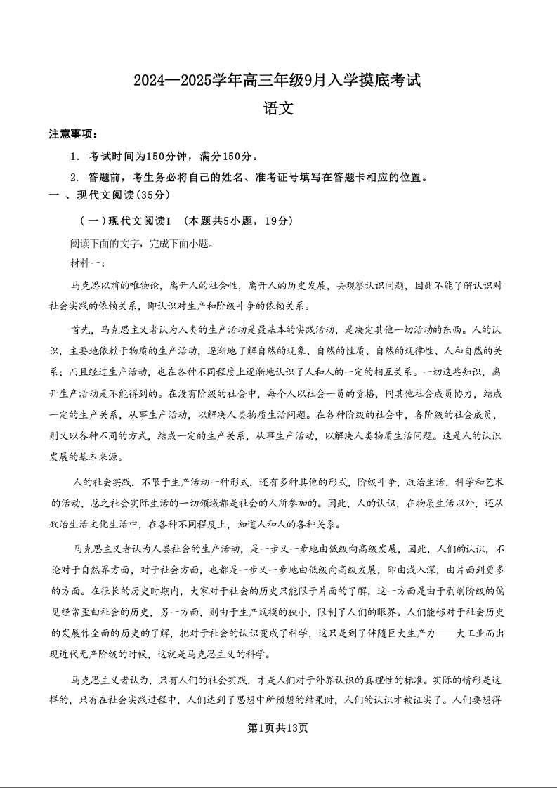 河北省新时代NT教育2024-2025学年高三入学摸底测试+语文