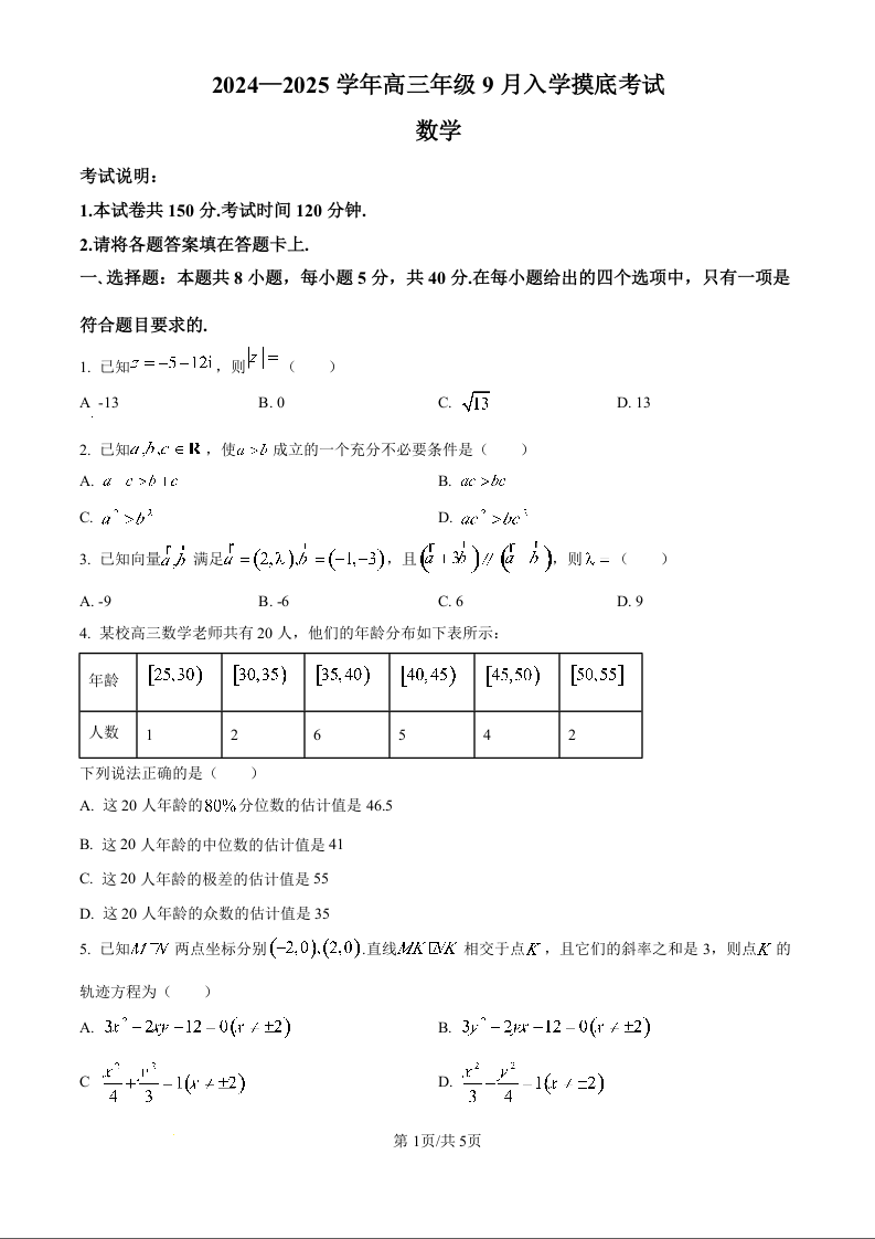 河北省新时代NT教育2024-2025学年高三入学摸底测试+数学