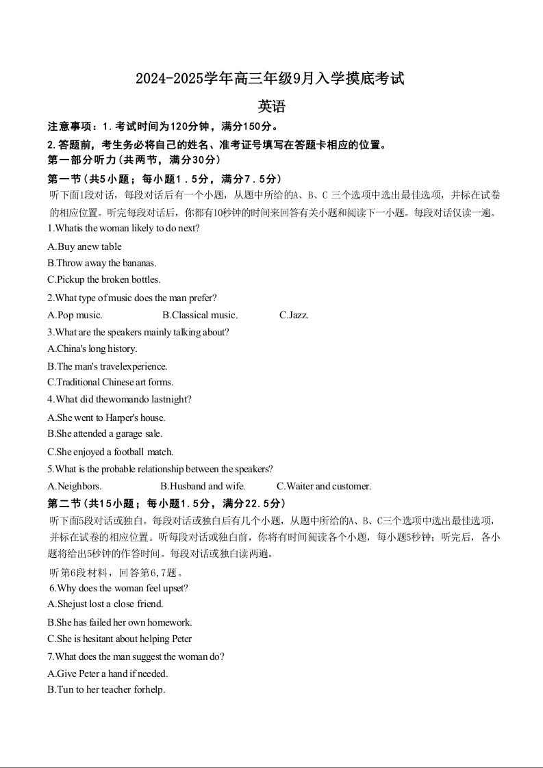 河北省新时代NT教育2024-2025学年高三入学摸底测试+英语