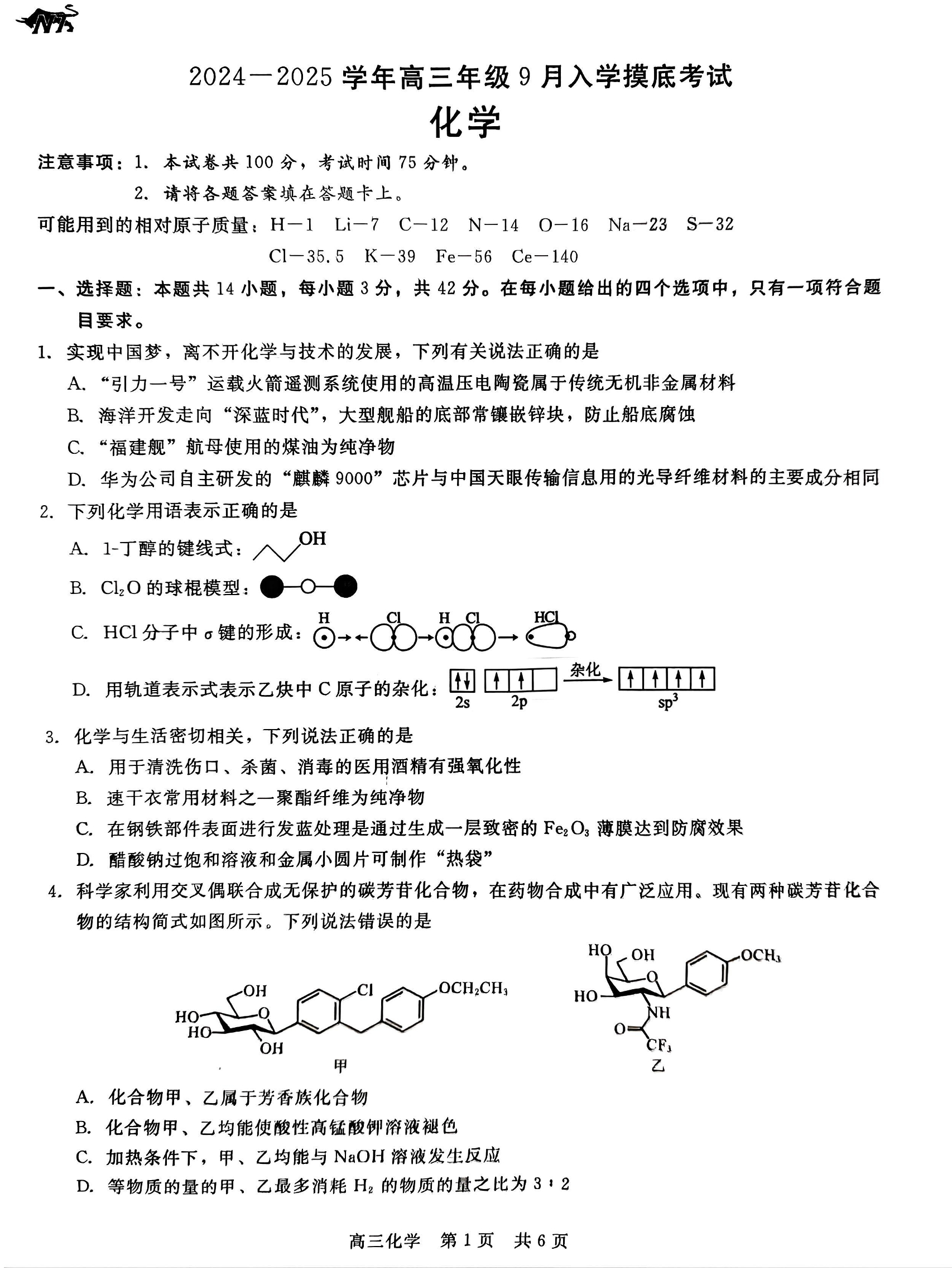 河北省新时代NT教育2024-2025学年高三入学摸底测试+化学