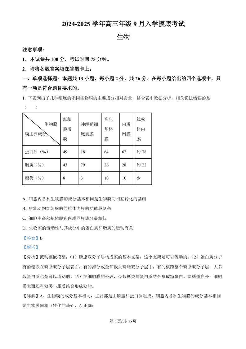 河北省新时代NT教育2024-2025学年高三入学摸底测试+生物答案