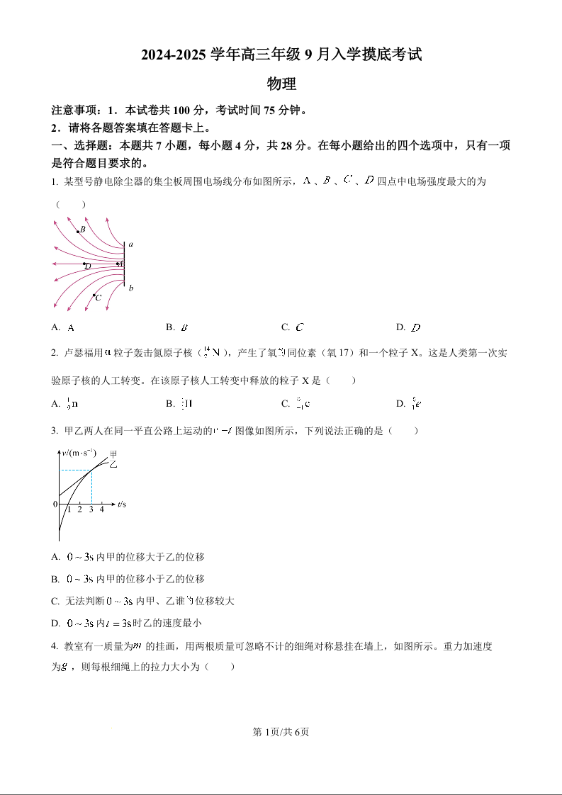 河北省新时代NT教育2024-2025学年高三入学摸底测试+物理