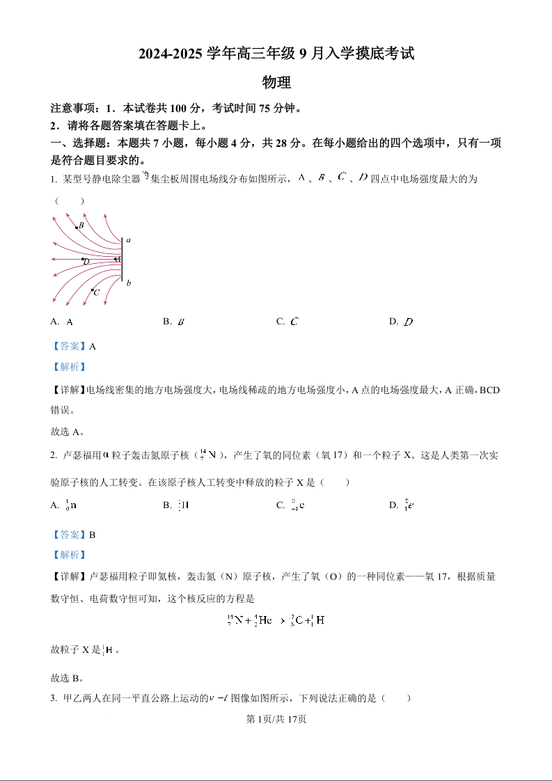 河北省新时代NT教育2024-2025学年高三入学摸底测试+物理答案