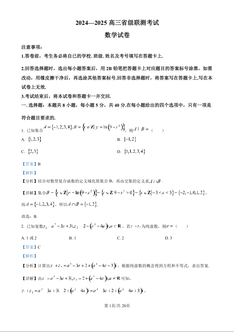 河北省2024-2025学年高三省级联测考试+数学答案