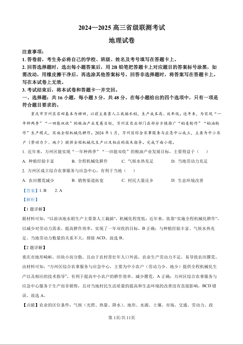 河北省2024-2025学年高三省级联测考试+地理答案
