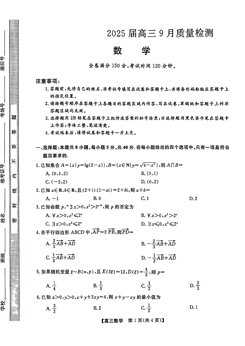 金科大联考·2025届高三9月质量检测+数学