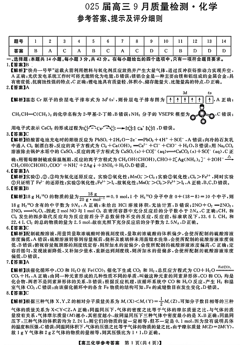 金科大联考·2025届高三9月质量检测+化学答案
