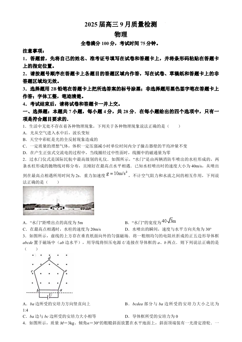 金科大联考·2025届高三9月质量检测+物理