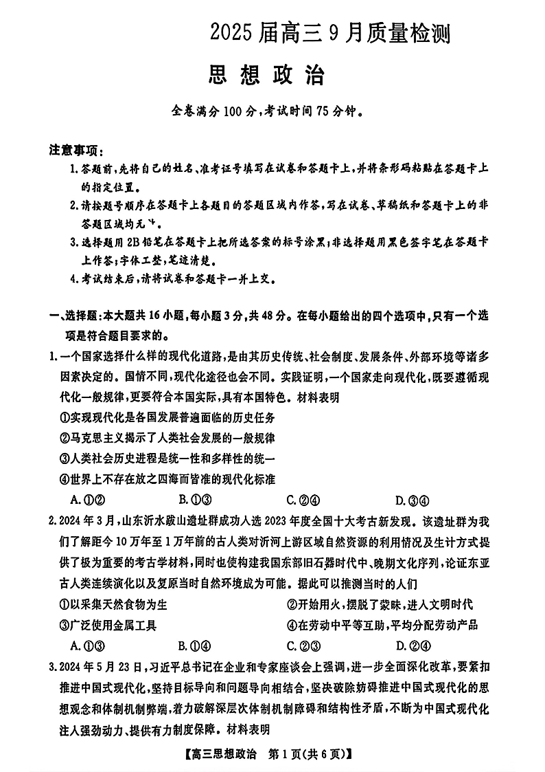 金科大联考·2025届高三9月质量检测+政治